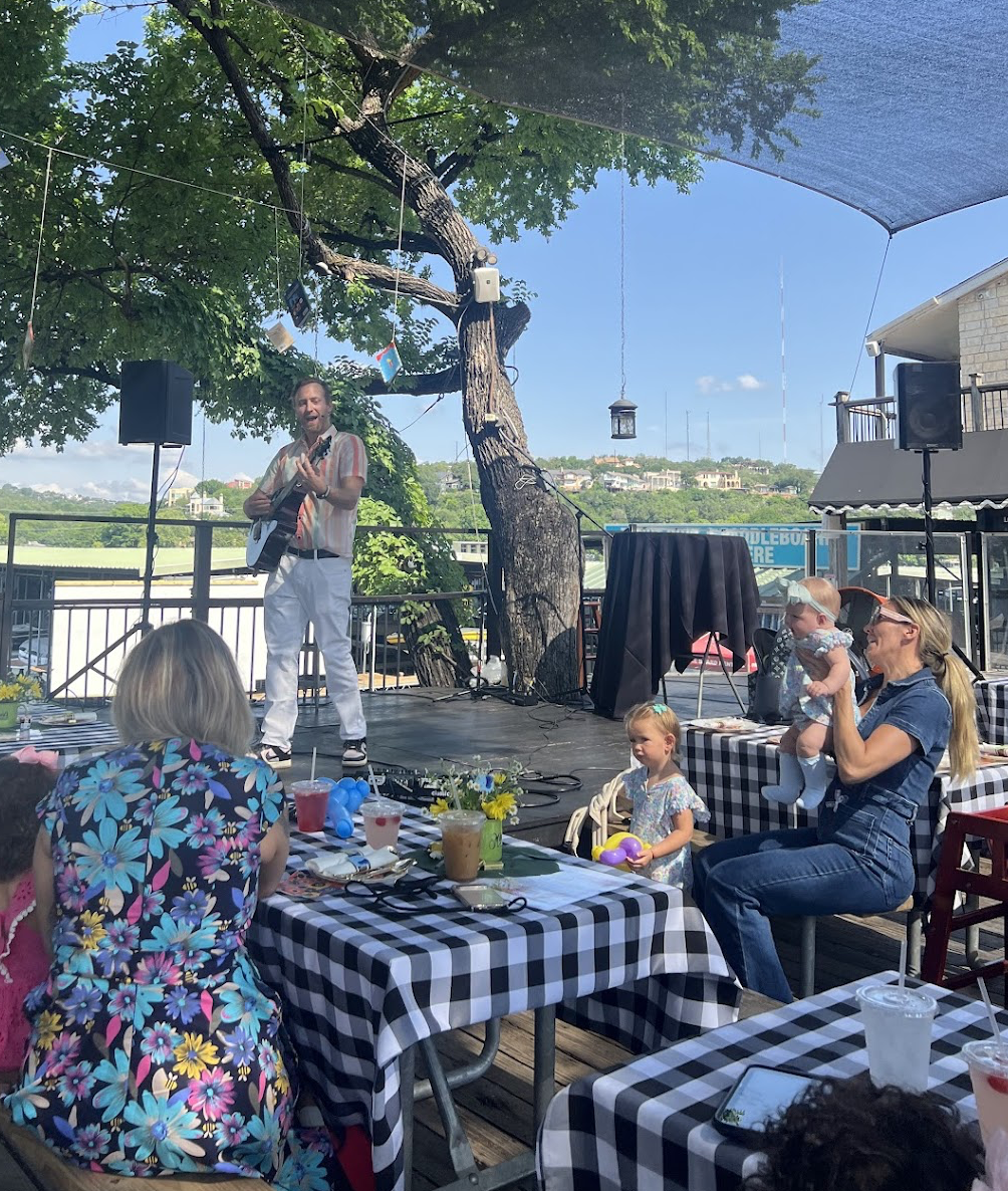 A man performing live music on an outdoor stage at a restaurant or cafe, surrounded by children and adults enjoying the show. The scene is shaded by a large tree and a sunshade, with a scenic background of rolling hills and a blue sky.