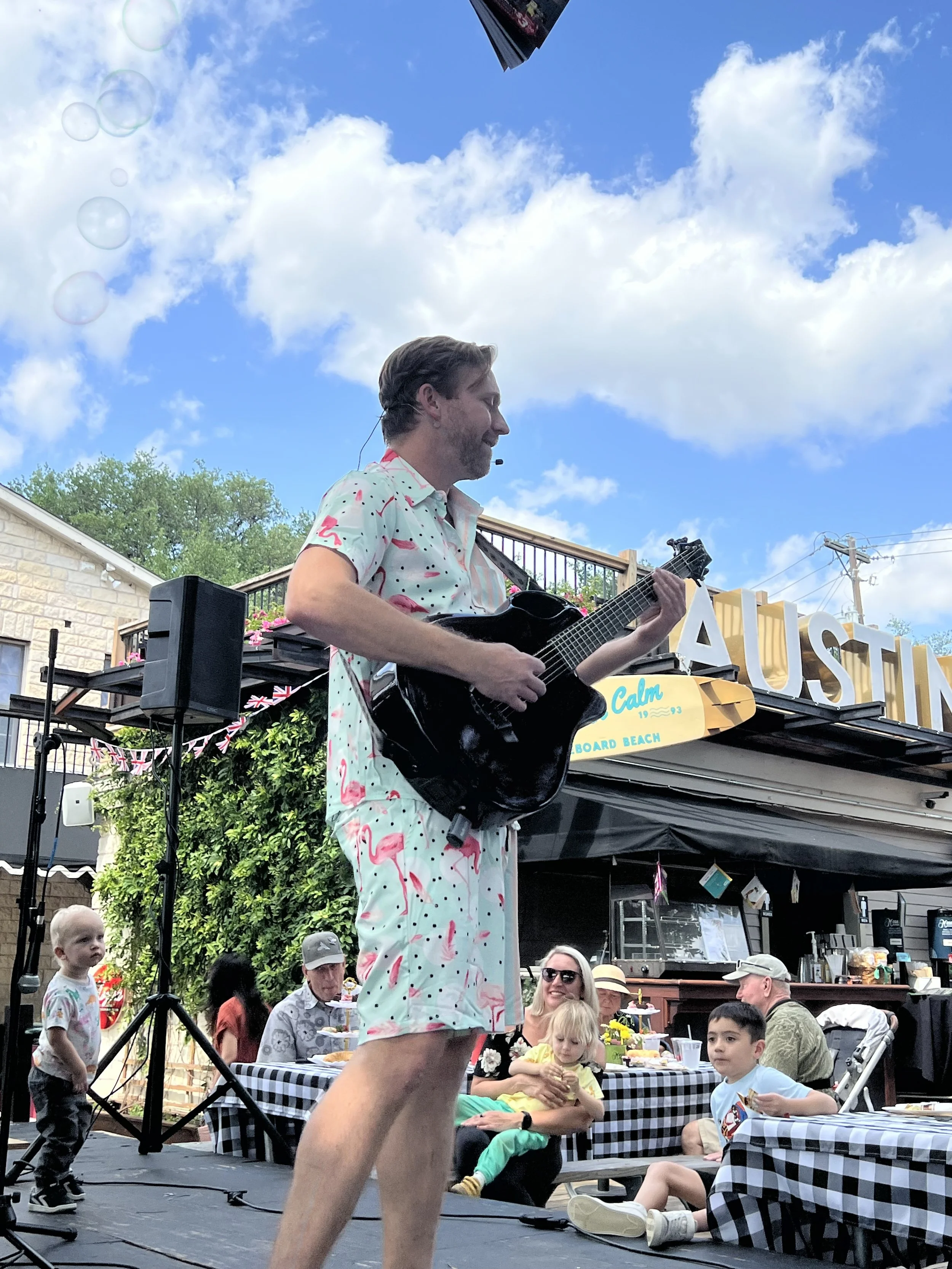Man playing guitar on outdoor stage with audience, children, and blue sky in background.